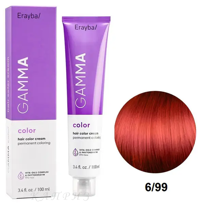ERAYBA GammaColor — Стійка крем-фарба для волосся. Містить Фітокератин® — запатентований комплекс натуральних амінокислот рослинного походження, аналог кератину волосся людини, який захищає структуру волосся в процесі фарбування. Гідролізовані протеїни пшениці, кукурудзи та сої кондиціонують, підсилюють блиск, надає волоссю м'якість і шовковистість. Спеціальні молекули кольору підвищують інтенсивність і стійкість фарбування. Олія насіння пінника лугового та UV-B фільтри забезпечують чудовий захист кольору. Не містить ПКД. У формі парфумованого крему.